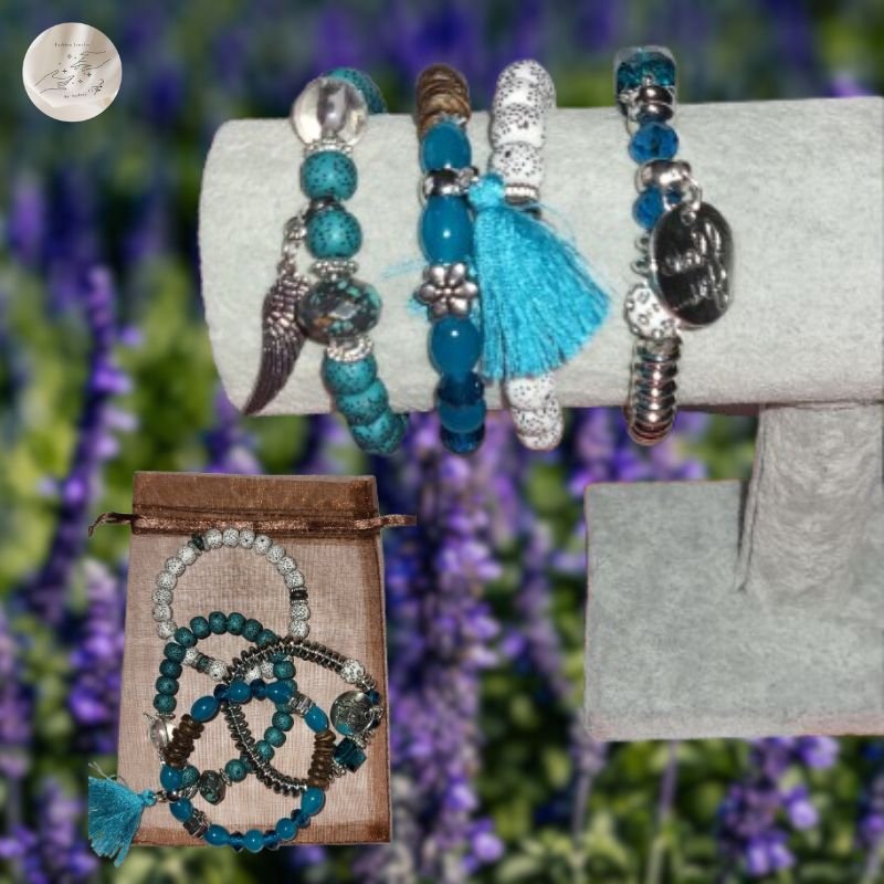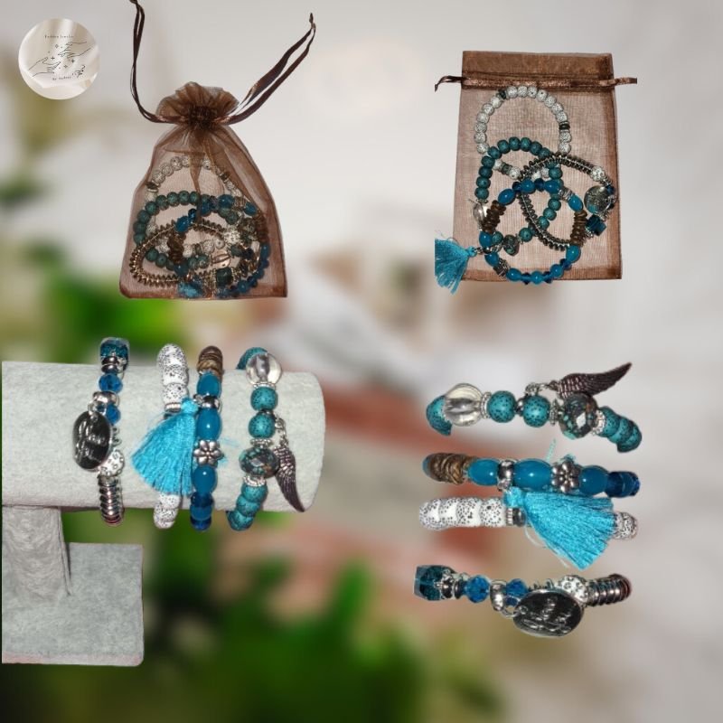 Chaque bracelet a son propre style : perles délicates, breloques en forme d’ailes, franges en textile doux et chaînettes dorées s’associent pour créer un mélange visuel captivant. Le thème des ailes symbolise la liberté, l’élévation et l’intuition, tandis que les franges apportent une touche bohème et féminine. Ce contraste rend le set particulièrement expressif, parfait pour celles qui veulent afficher leur originalité avec grâce.