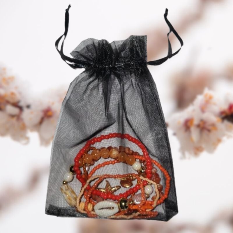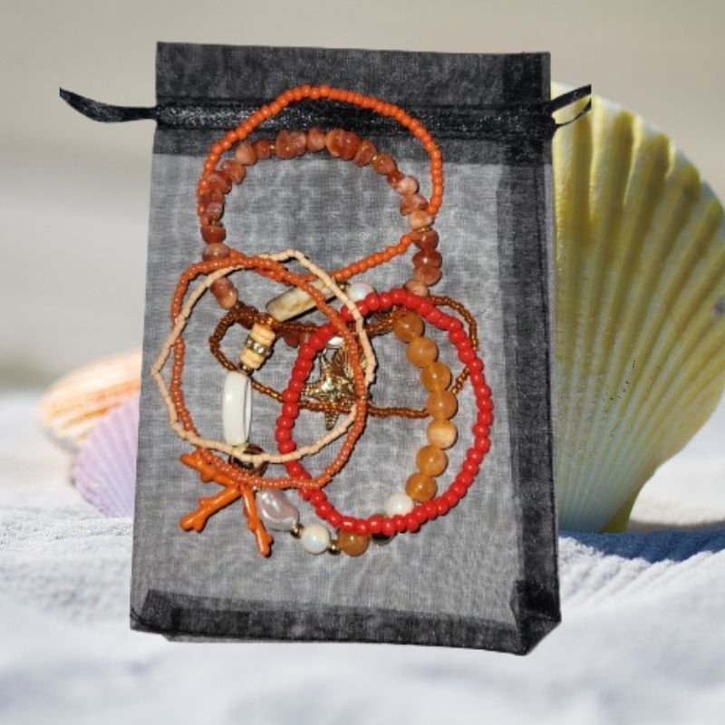 Les bracelets sont confectionnés à partir de pierres naturelles et de perles orange, symbolisant la paix intérieure, la fluidité et la guérison. Les nuances de bleu évoquent l’océan, la sérénité et la liberté, ajoutant une dimension zen et rafraîchissante à votre tenue.