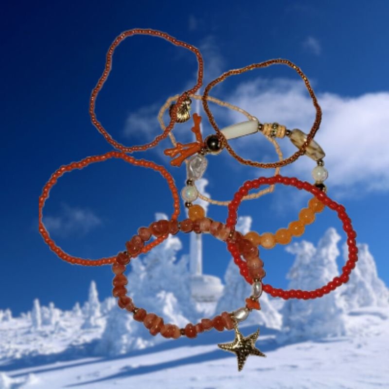 Ce set comprend 6 bracelets distincts, qui peuvent être portés ensemble ou séparément selon votre humeur ou votre tenue. Ils sont ornés de perles orange rappelant l’eau et la sérénité, de pierres naturelles véritables, de pendentifs Arbre de Vie, et d’autres éléments qui évoquent l’équilibre, la paix et l’harmonie intérieure.