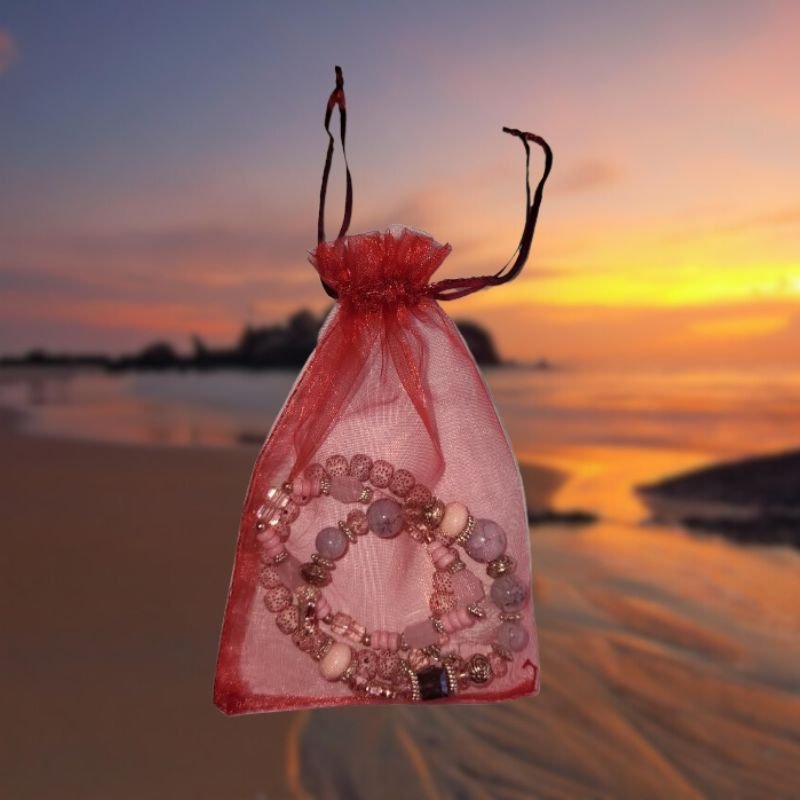 Ce set se distingue par son coloris rose pastel, synonyme de tendresse, douceur et optimisme. Le rose pâle s’accorde facilement avec des looks clairs, des tenues bohèmes, ou même des styles romantiques. Il est parfait pour adoucir un look tout en lui donnant une touche chic 💞
