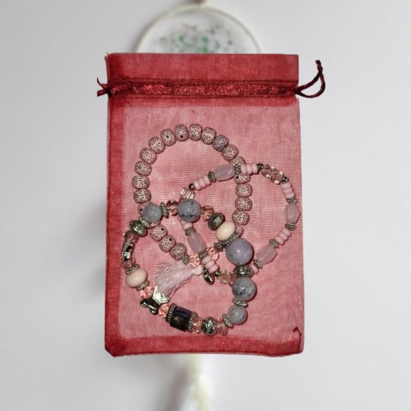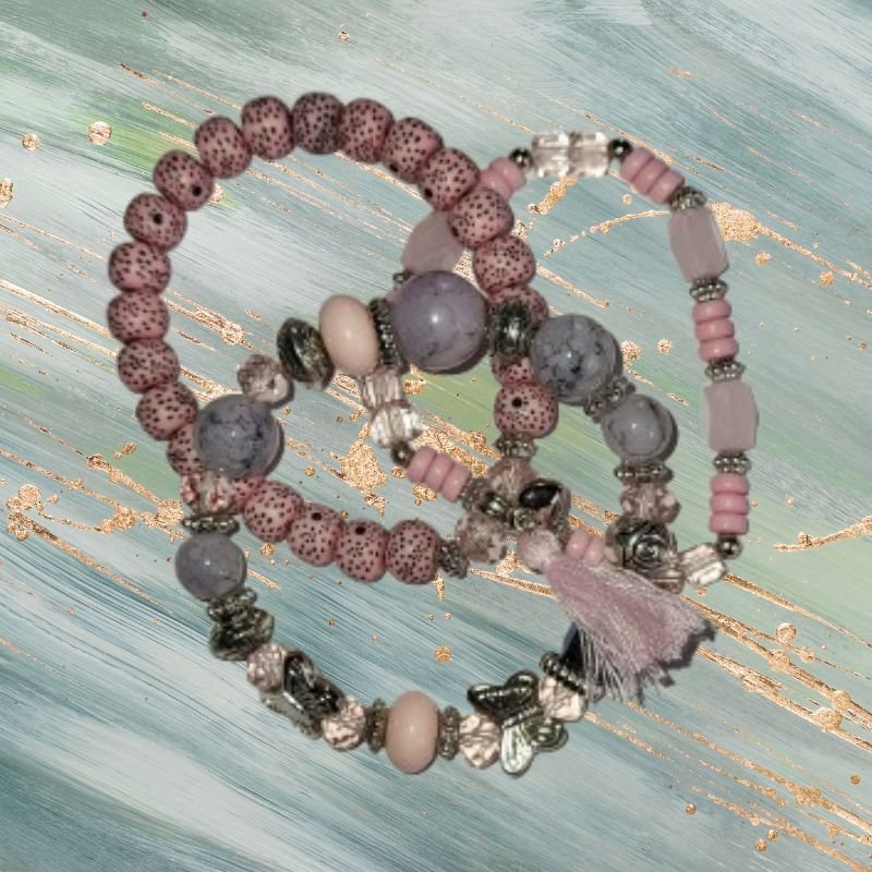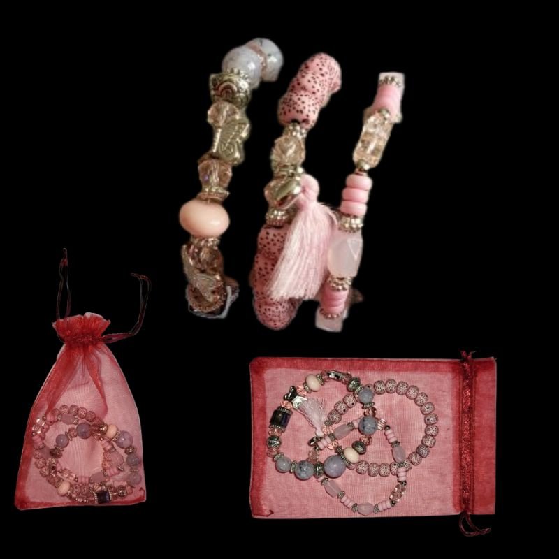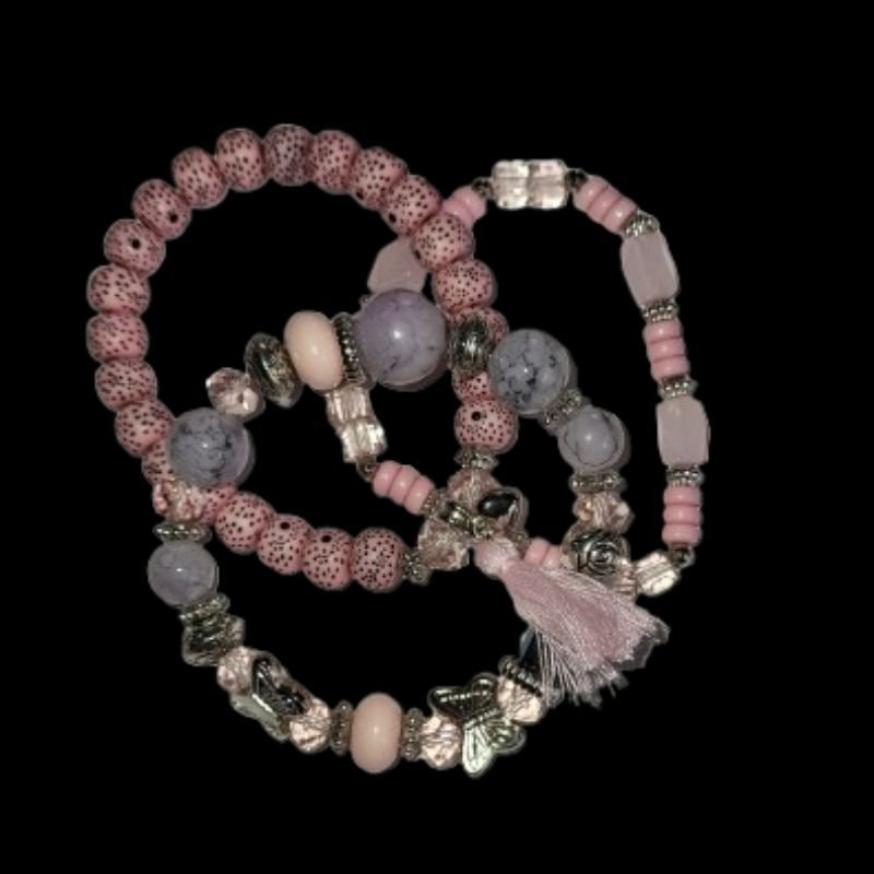 Ce magnifique set de 3 bracelets rose pâle vous accompagne avec grâce et douceur. Chaque pièce présente un univers féminin et tendre, avec des papillons, des franges délicates et un pendentif cœur.